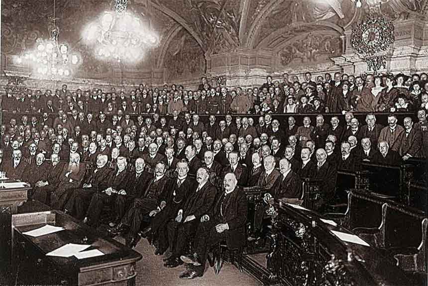 1918 kam es zum Zusammenbruch der österreichisch-ungarischen Monarchie. Am 21. Oktober 1918 konstituierten sich im NÖ Landhaus, im großen Sitzungssaal, die deutschsprachigen Reichsratsabgeordneten zur „Provisorischen Nationalversammlung des selbständigen Deutschösterreichischen Staates“, war also hier die Geburtsstunde der 1. Republik.
